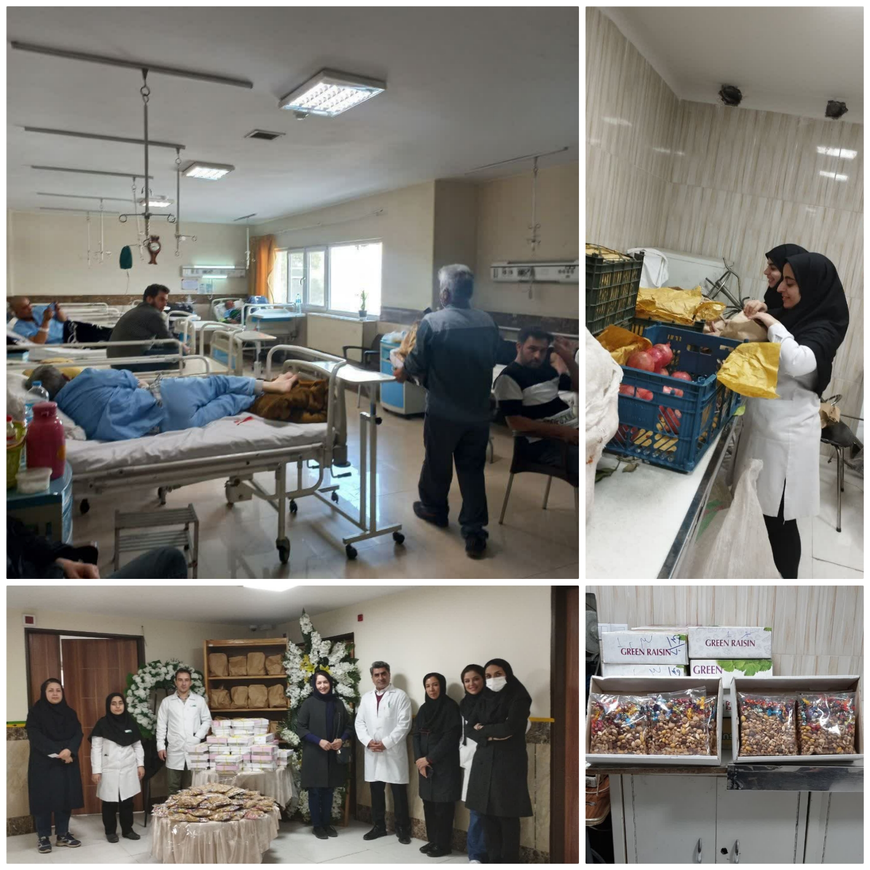 این مراسم برای همه بیماران بستری در بخشهای مختلف برگزار شد و با میوه، آجیل و شیرینی و... از آنان پذیرایی به عمل آمد. آقای دکتر ایروانی مدیر بیمارستان درباره این برنامه گفت: یلدا یعنی یادمان باشد که زندگی انقدر کوتاه است که یک دقیقه بیشتر با هم بودن را باید قدر دانست و همه ما در بیمارستان سعی کردیم که این لحظات خوب را کنار بیماران بستری باشیم که علیرغم دوری این عزیزان از خانواده،خوشحالی و شادی را به آنها هدیه دهیم. وی از خیرین و کارکنان بیمارستان که در برگزاری این مراسم نهایت تلاش خود را انجام دادند تشکر کرد. این برنامه با مشارکت جمعی از خیرین و نیکوکاران ارجمند برگزار شد.