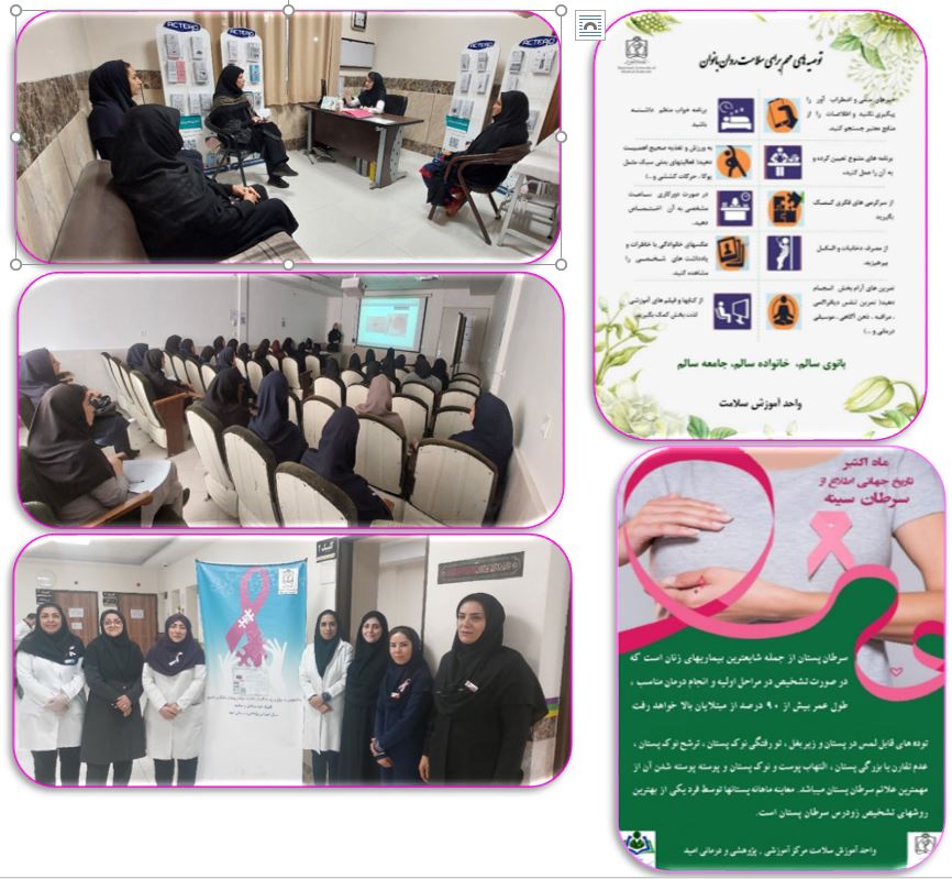 - آموزش همگانی بانوان در ارتباط با راههای پیشگیری از کانسر پستان، نحوه انجام خودآزمایی پستان و ارائه پوستر غربالگری کانسرپستان در کلینیک سلامت(به طور مستمر از چند سال گذشته در حال انجام است)، راهنمایی و ارجاع خانواده بیماران به مراکز بهداشت جهت غربالگری